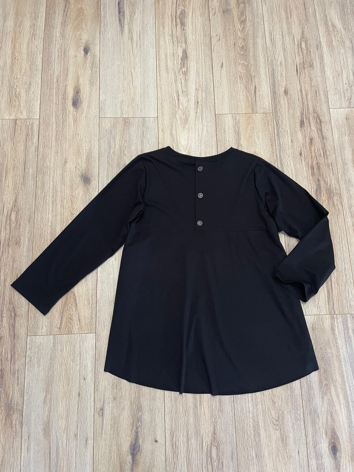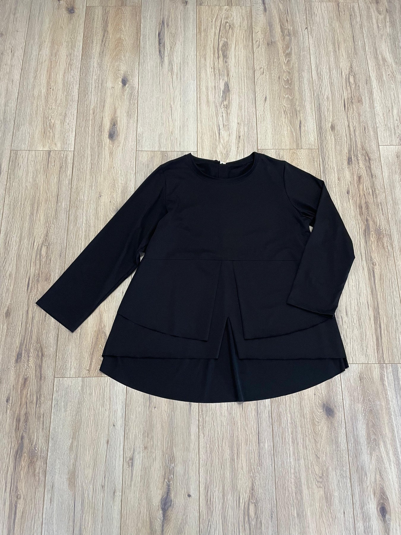 Sencilla, fluida y con un toque sofisticado. Esta camiseta negra de capas destaca por su caída elegante y corte asimétrico, ligeramente más corta por delante que por detrás, creando un movimiento natural y favorecedor.