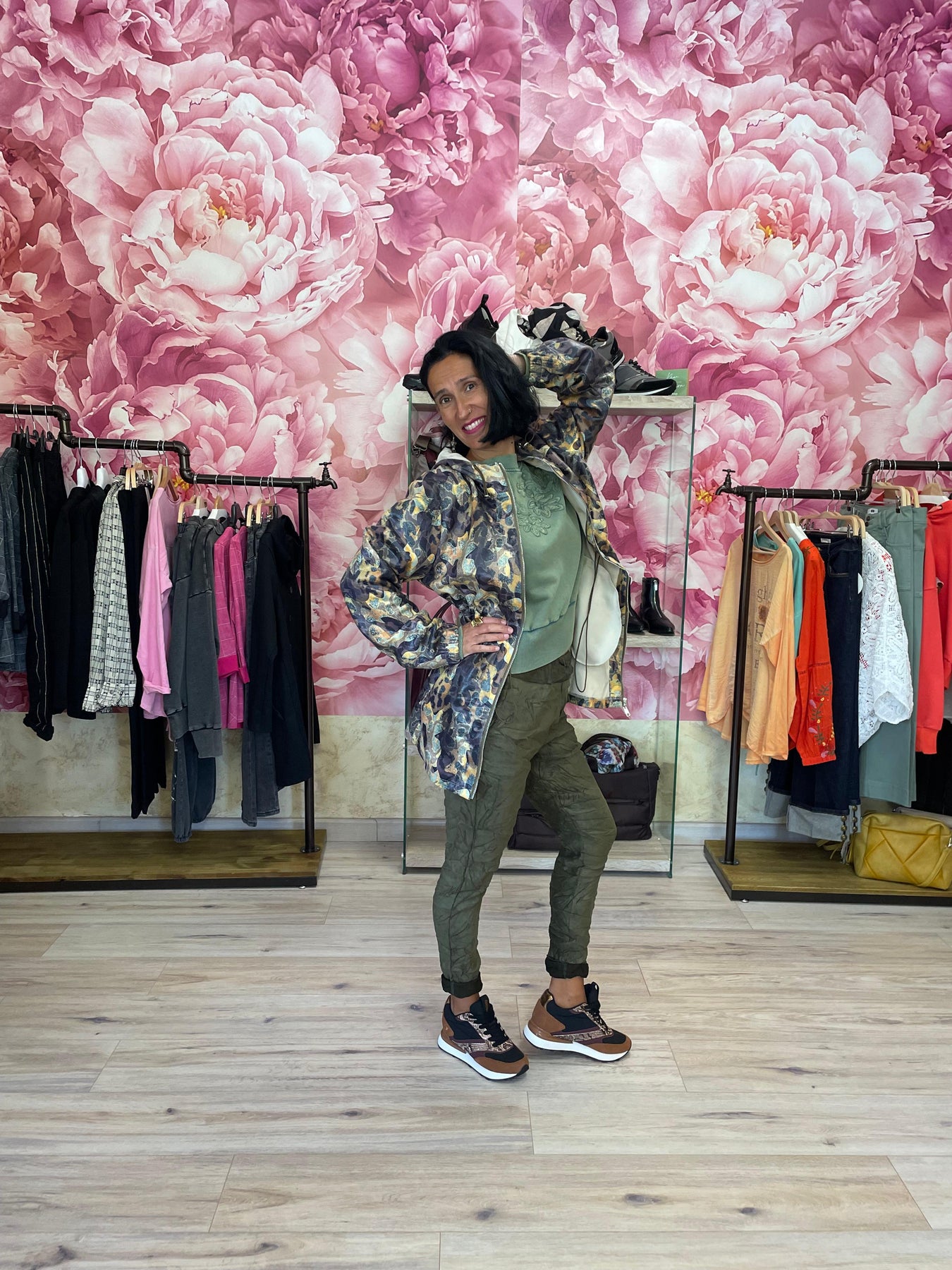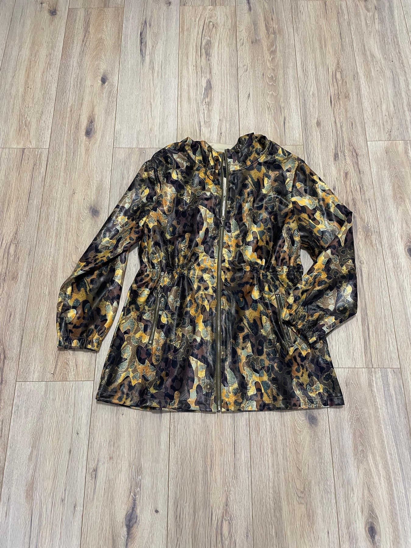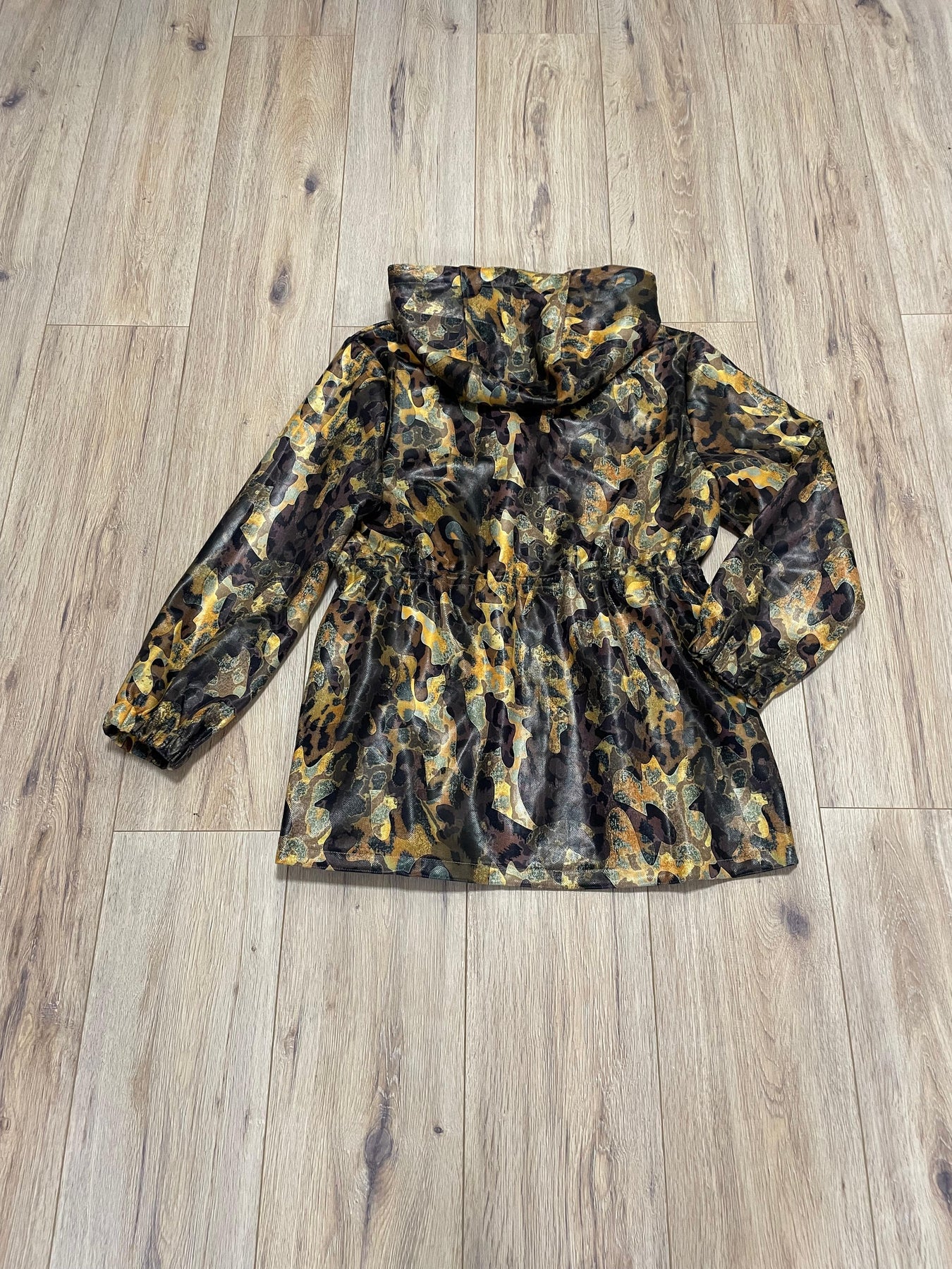 Abrigo tres cuartos con capucha y un estampado natural en tonos chocolate, mostaza y negro, inspirado en la calidez de la tierra y la fuerza del otoño.