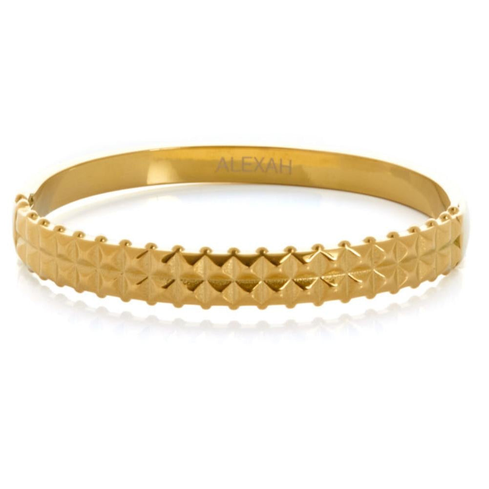 Brazalete rÃgido de acero inoxidable con diseño geométrico de cuadros en relieve, que combina elegancia y carácter en una sola pieza.