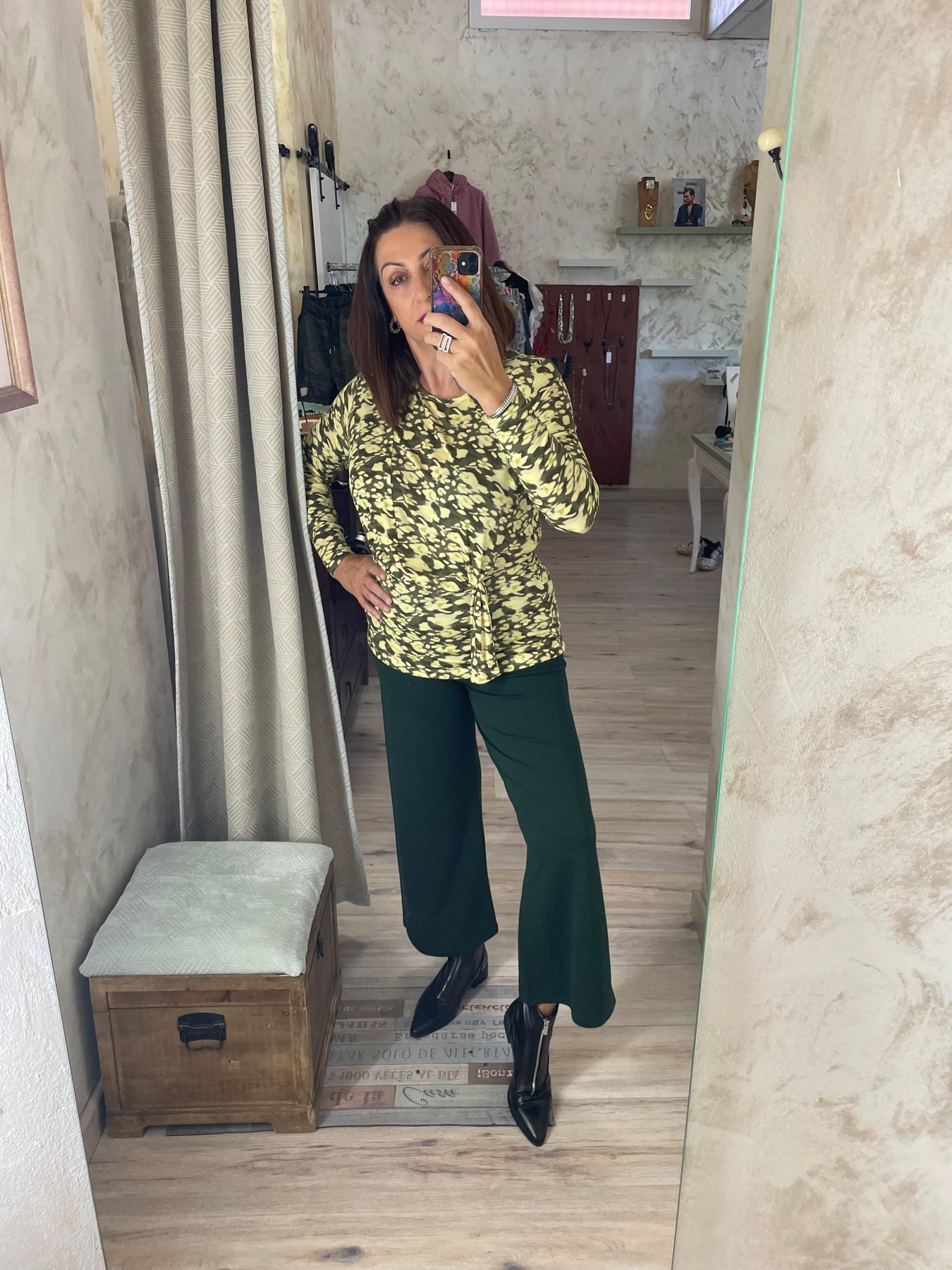 Combínala con pantalones verdes, beige o negros para un look armonioso y elegante. Perfecta para entretiempo o para llevar debajo de una americana.