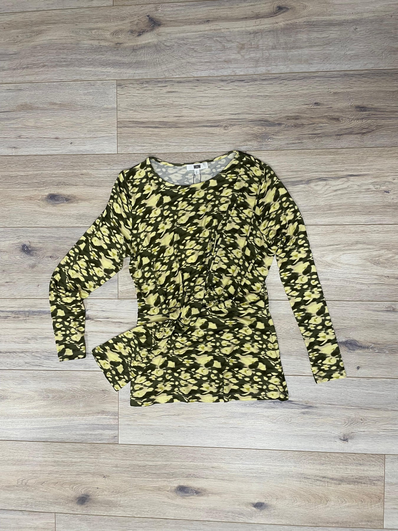 Camiseta de manga larga con estampado orgánico en tonos caqui y vainilla, inspirada en la naturaleza.