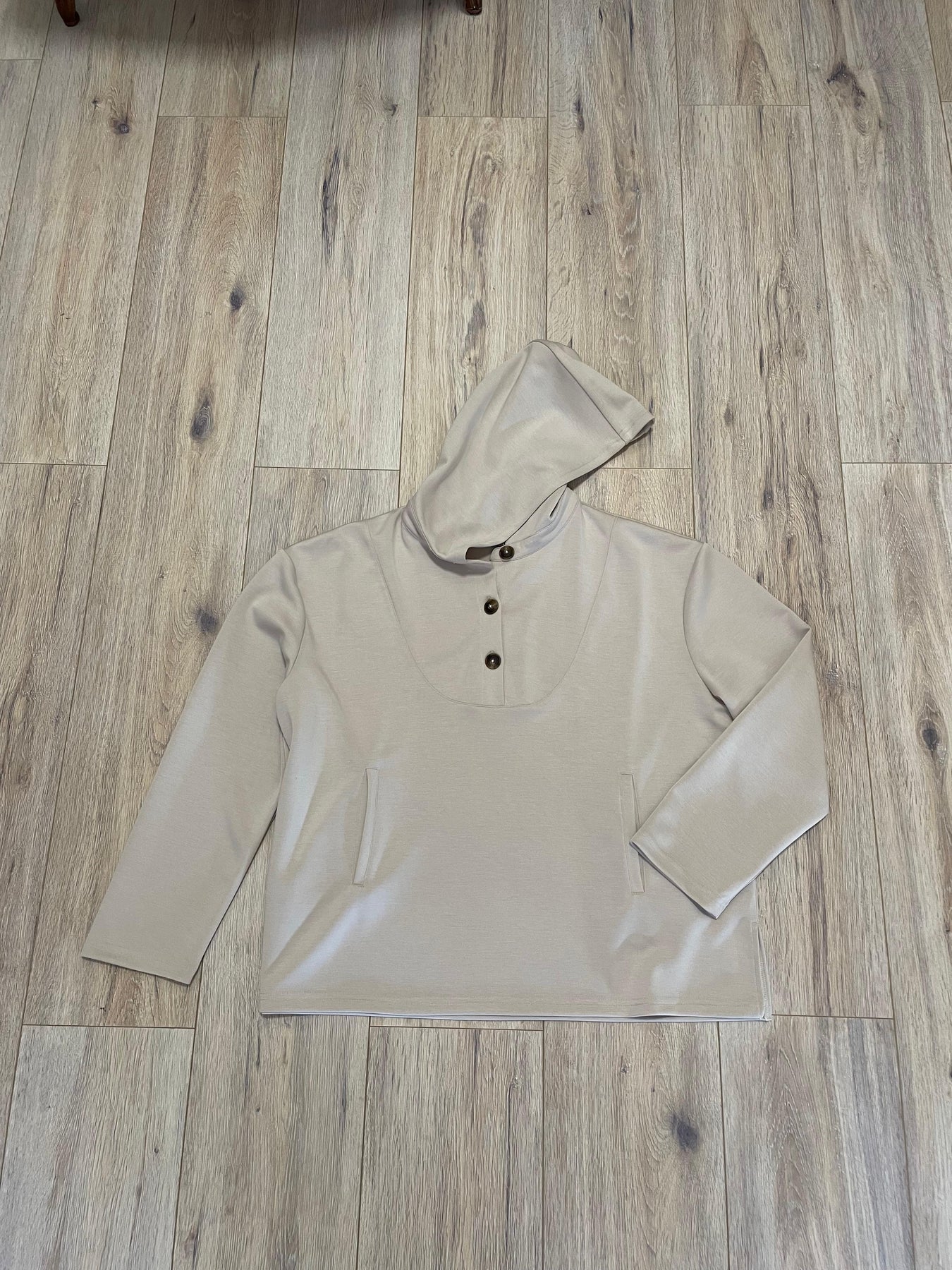 Comodidad, estilo y versatilidad en una sola prenda. Nuestra Sudadera 3 Botones combina un diseño fluido y favorecedor con detalles que marcan la diferencia: capucha amplia, aperturas laterales y un elegante escote con tres botones delanteros.