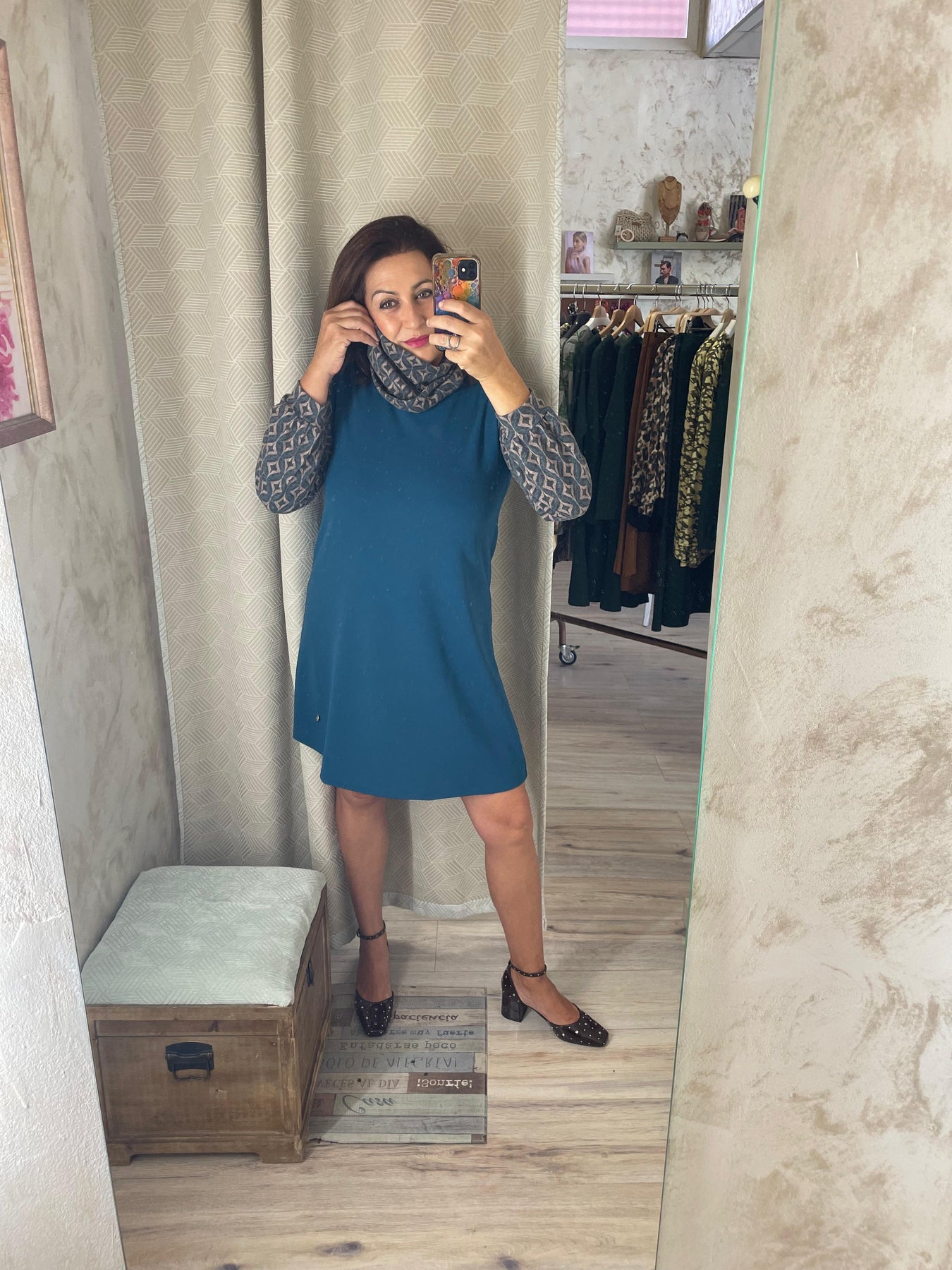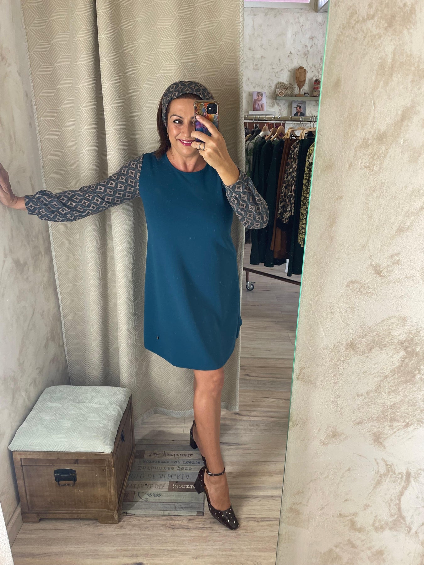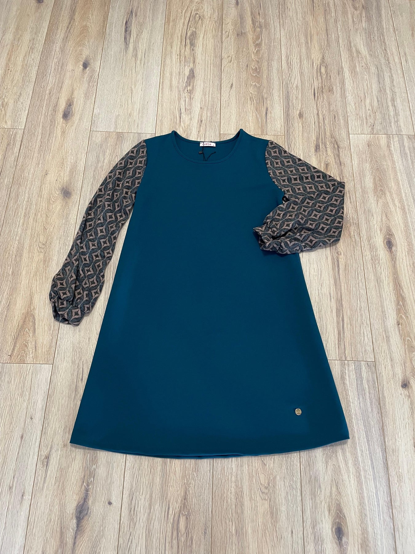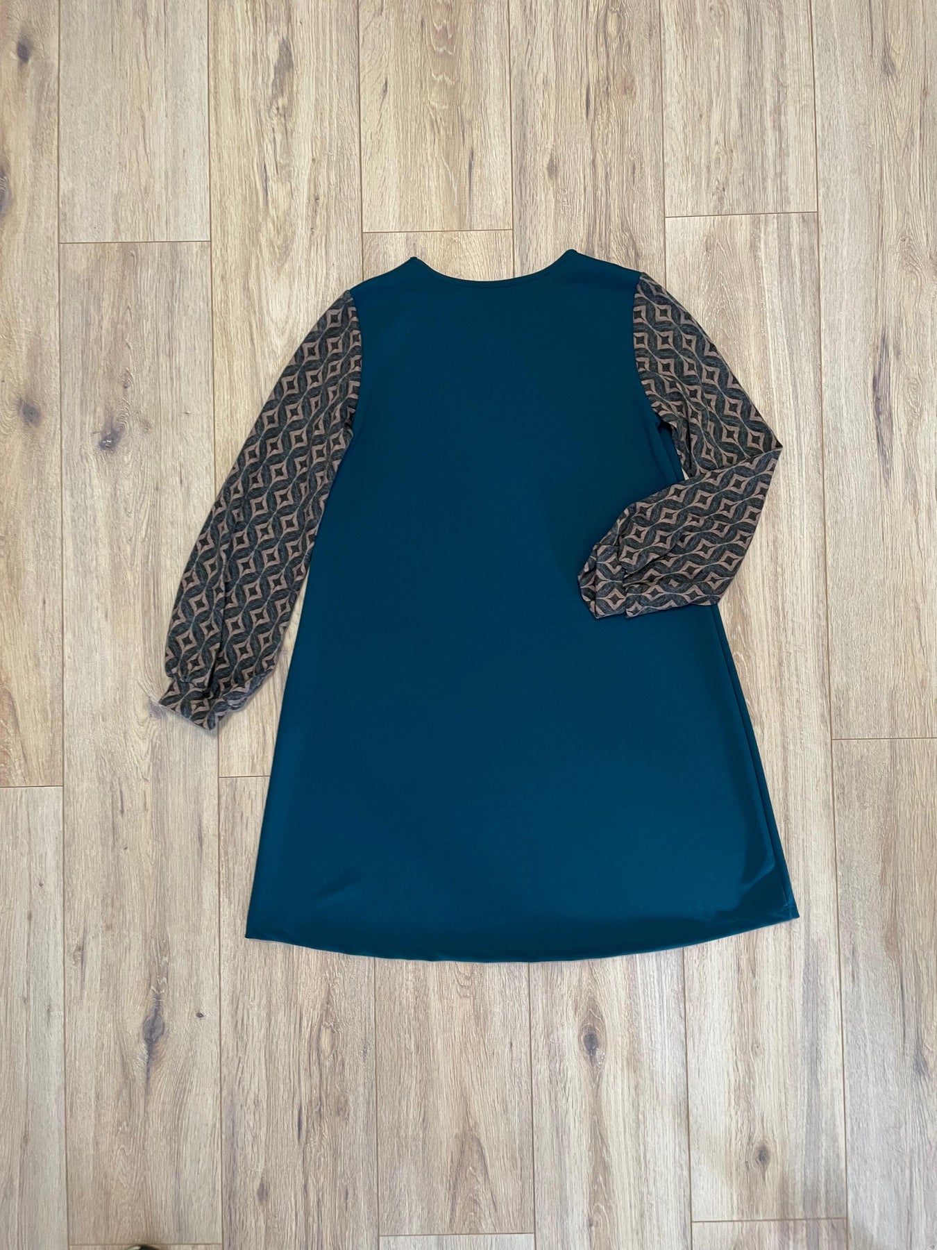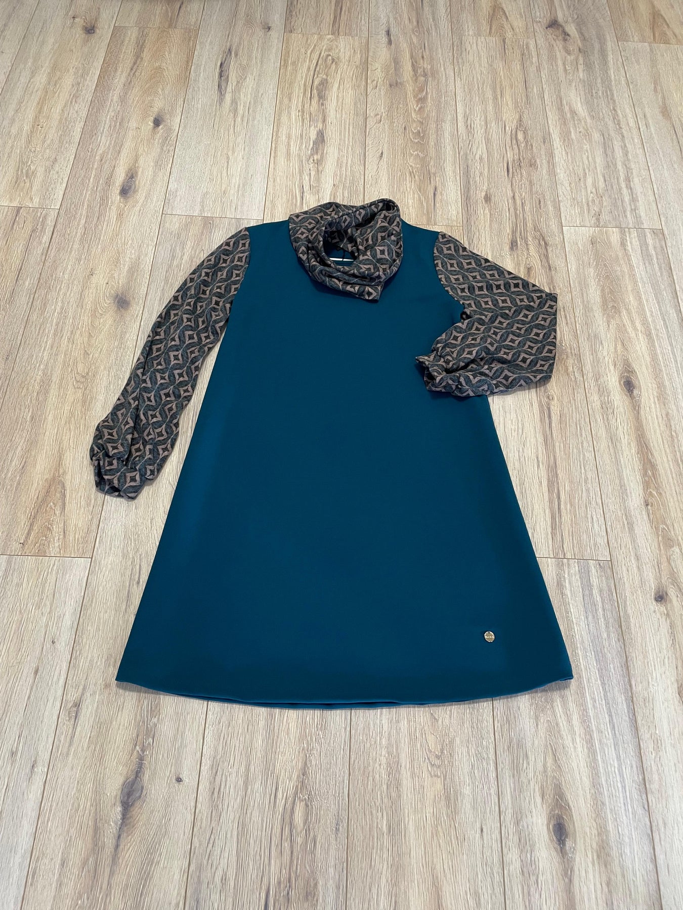 Un diseño elegante, cómodo y con mucho carácter. Este vestido azul petróleo combina un tejido liso en la parte frontal y trasera con mangas de punto fino estampadas, creando un contraste sofisticado y muy actual.